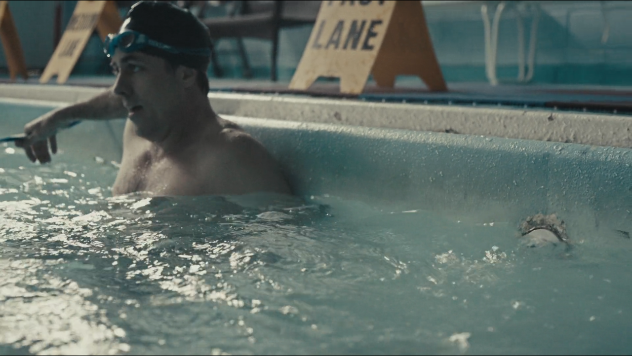 At the start we see her doing laps in the pool. She passes a man who is tired and spent, but she keeps moving.